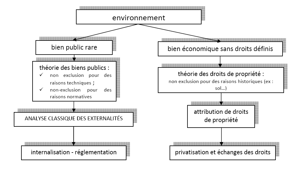 La figure illustre les deux conceptions différentes du point de vue juridique et moral que la théorie économique propose pour analyser l’environnement ( [1]). Ces deux conceptions sont à l’origine d’une vaste palette d’instruments de protection de l’environnement que la science économique est en mesure de proposer. D’un point de vue analytique, elles ont en commun, au-delà de leurs différences, de relever de la même analyse microéconomique néoclassique et d’aboutir toutes trois à la détermination d’un optimum parétien, permettant au système de prix en vigueur sur les marchés de maximiser le bien-être collectif tout en prenant en compte les effets de la pollution par exemple.